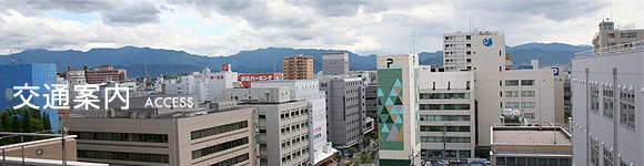 市内電車、リムジン、高速バス。主要交通機関の全ての停留所から徒歩1~2分です。電車は「県庁前」、リムジン・高速バスは「大街道」で下車して下さい。